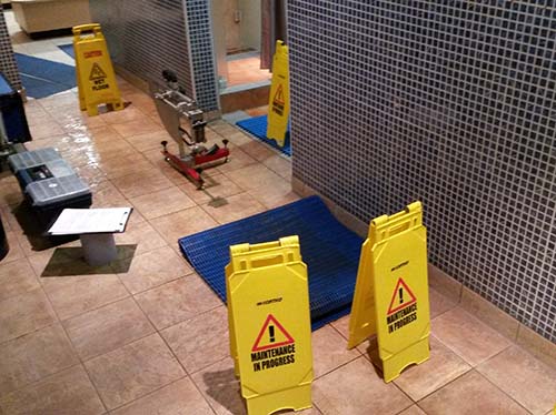 “We’re used to work going on around us, but with people wanting to squeeze past us in such a small area, this hampered us a little” Mr Scarfe told us. “So in terms of safety, we set up a very noticeable cordon warning that we were at work, and giving plenty of awareness of where we were. With the floor being slippy, we didn’t want to surprise people who wanted to enter the shower or changing areas and make the hazard under foot even worse.”